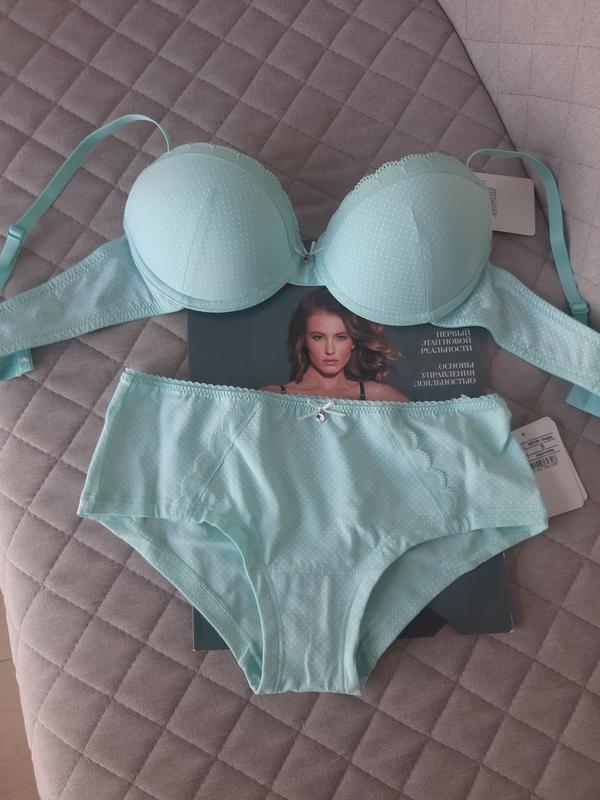 Хлопковое мятное белье.Смотрится очень свежо и нежно.Бюст с пуш-ап.Полностью удобная.Трусики-шортиками.Бюст 70А трусики S🌸