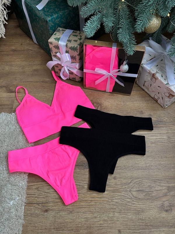 В набор входят наши хиты продаж: базовый комплект в рубчик с трусиками стрингами на высокой посадке и двое черных трусиков на каждый день (одные стринги и одни бразильяны). С этими наборами вы можете не только выгодно обновить свой гардероб белья, но и сделать подарок подруге, маме или сестре 🥰