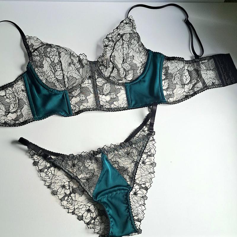 Ручная работа Комплект из шелка Армани и вышитого кружева.Бюстье с классической чашкойТрусики бразилы на регуляторахОтправка 5 - 7 рабочих днейПередача 500грн.