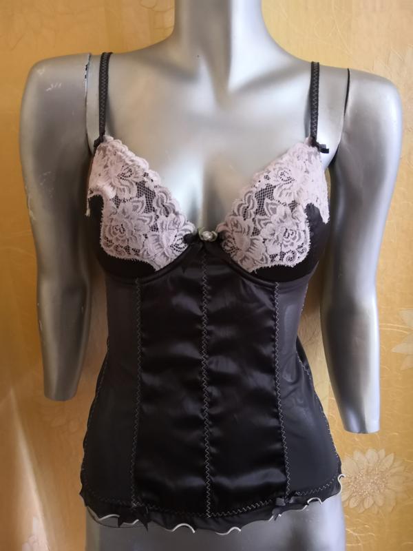 Корсет. Размер - 75/80 В. Полная длина от застежки до застежки 70 см., тянется до 110 см. Висота чашки - 13 см. Ширина чашки - 15 см. Длина всей вещи - 49 см. Материал - сеточка и атлас, кружево. Кружево свет ло-розового цвета. Чашка на тонком поролоне. Бирка срезана.
