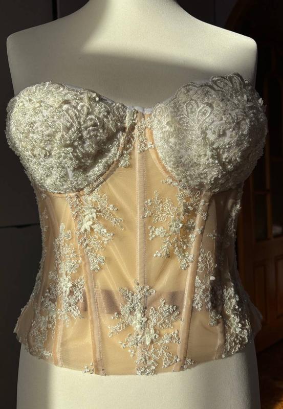 Корсет ручной работы, выполненный из бисера и кружной ткани под параметры: горизонтальна дуга - 29 см. от - 87 см. ог - 98 см. обхват под грудью - 87 см. Бретели идут в комплекте. Чашка С