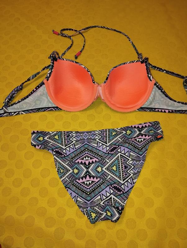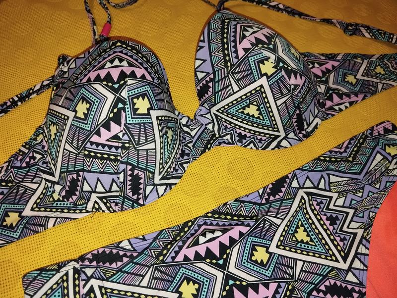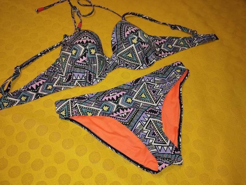 Купальник HUNKEMOLLER , бірку зрізала, підійде на 85D - 80E. Дуже гарна форма чашки, трусики теж в міру закриті, зручної посадки. Чашка з формованого м"якого поролону без пуш-апу, шлеєчки, що зав"язуються за голову з"ємні. Заміри бюста: довжина обхвата під грудьми 75см, висота чашки ( заміри з середини) 16.5см, щирина - 21.5см. Трусики: висота 25.5см, ПОТ 38.5см. Стан чудовий, єдиний нюанс - на додаткових шлейках, що за шию йдуть, через те, що зберігалися туго зав"язаними , то в цих місцях в середині пересохла резинка.