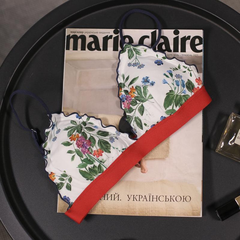Треугольный верх бикини на подкладке с волнистыми оверлочными краями и мягкими чашками со съемными вставками, которые формируют бюст и обеспечивают легкую поддержку. Узкие регулируемые лямки, широкая резинка по подолу и металлическая застежка сзади. размер XS / S длина по низу 55,5 см высота чашки по середине 12 см ширина чашки 11 см состояние идеально