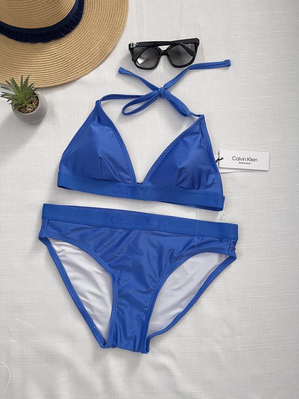 Качественный удобный и сексуальный купальник Calvin Klein. Отлично подчеркивает фигуру. Материал с шиммером, так же красиво мерцает на солнце. Раздельная моделька, без которой не обойтись летом, будь то пляж или бассейн. Верх - бюст треугольники со съемными чашками для идеальной поддержки. Завязывается за шею, застегивается крючком сзади (два уровня застежки). На эластичной резинке лого фирмы. Низ - плавки бикини закрытого типа с эластичной резинкой с логотипом фирмы на ней. Материал - 83% Nylon, 17% Spandex В наличии голубой в размере S Замеры: бюст: высота чашки 19 см, ширина 17,5 см плавки: ширина по талии 38 см, высота 25 см В наличии серый распаровка (верх S, низ М) Замеры: бюст: высота чашки 19 см, ширина 17,5см плавки: ширина по талии 39 см, высота 26 см
