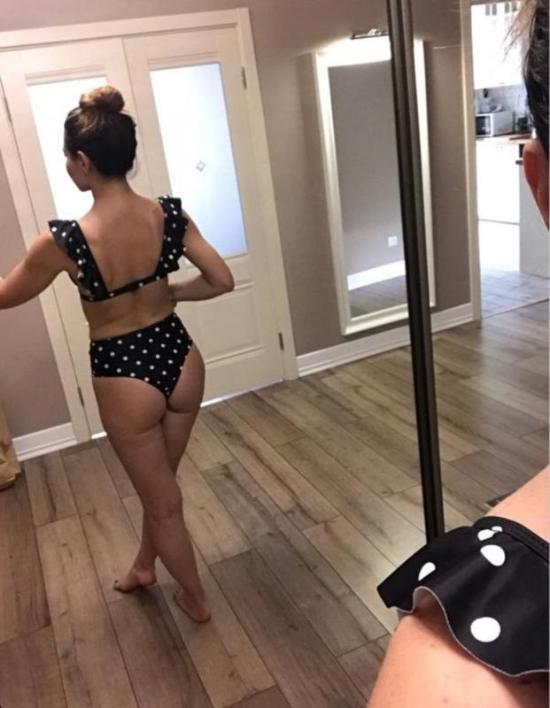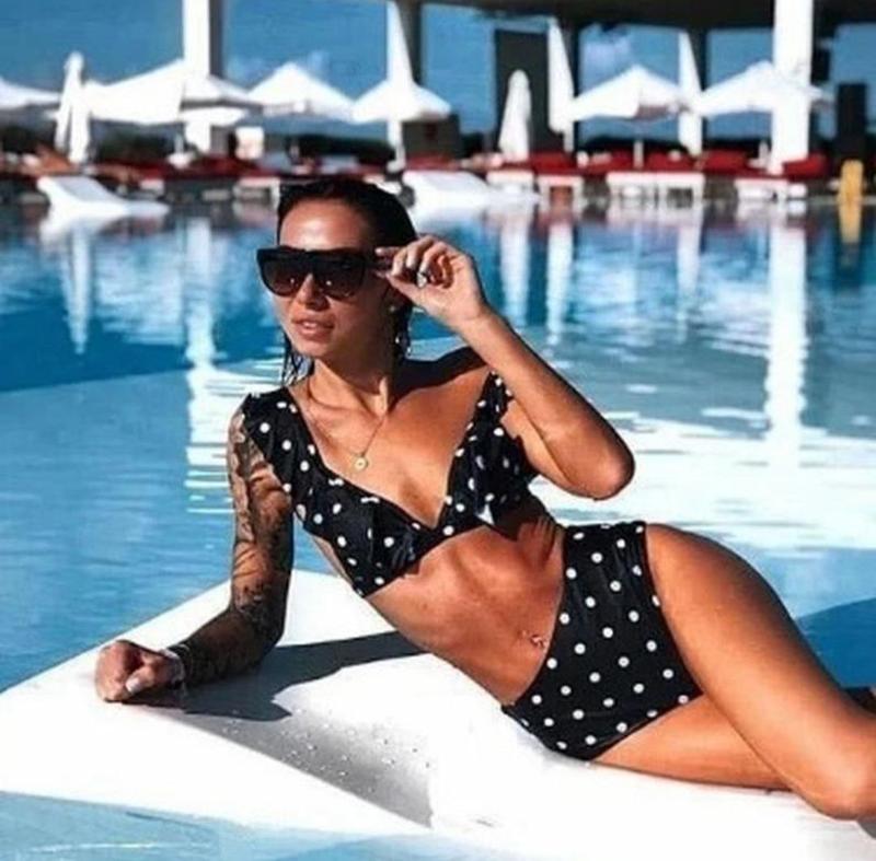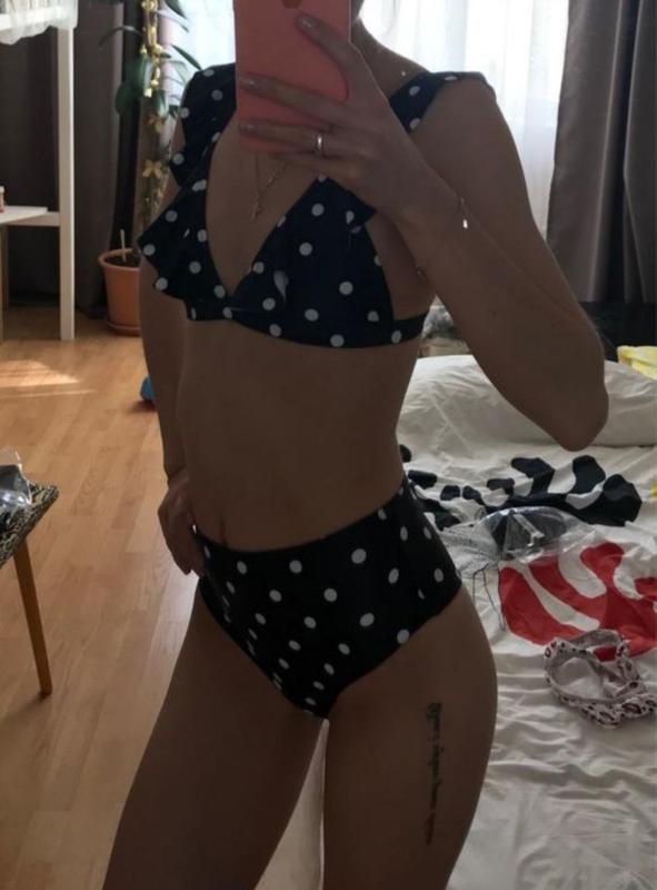 Красивый женский купальник в горошек в стиле VS. Трусики завышенные, визуально удлиняют ноги, красиво подчеркивают талию. Лиф без пуш-ап со съемными паралоновыми вставками. Размер S,M.