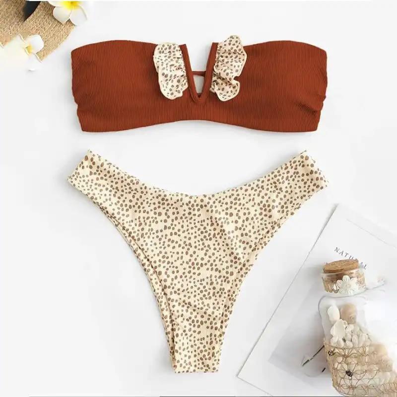 Купальник топ плавки бразилиана беж коричневый в горошек