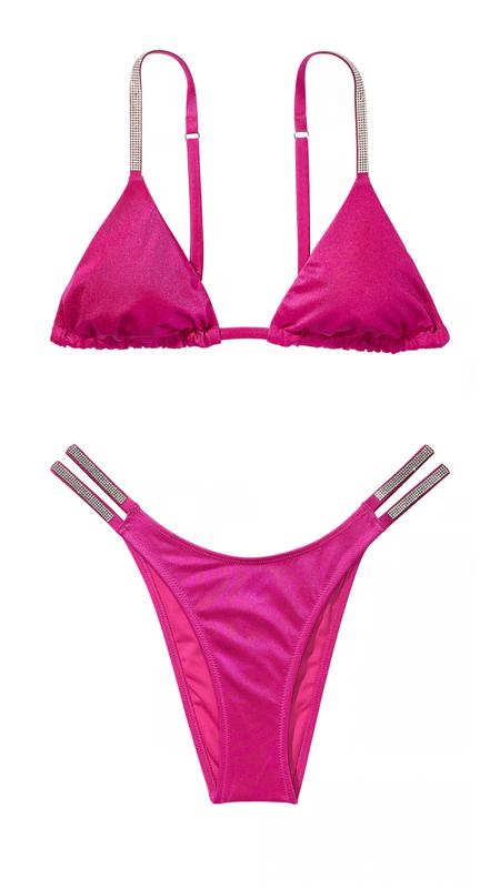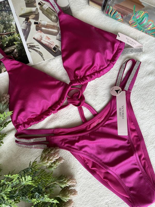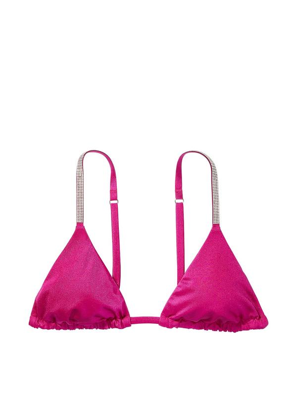 Классический треугольный верх с блестящими бретельками. Чашки без косточек со съемными вкладышами. Сзади на завязке.