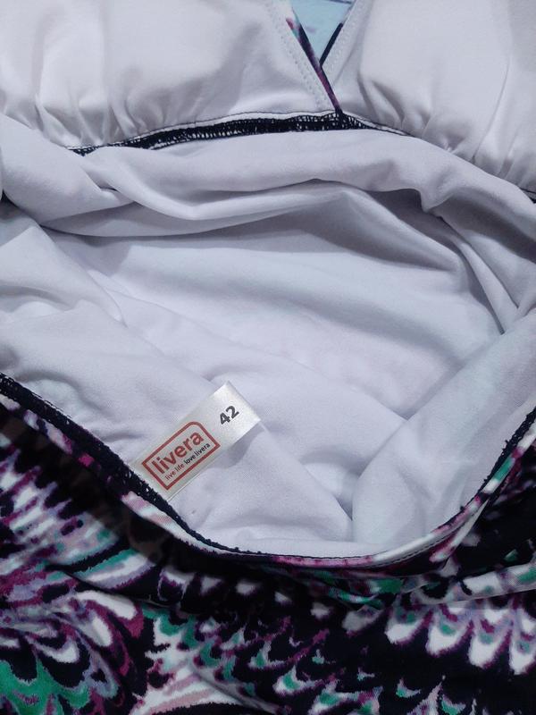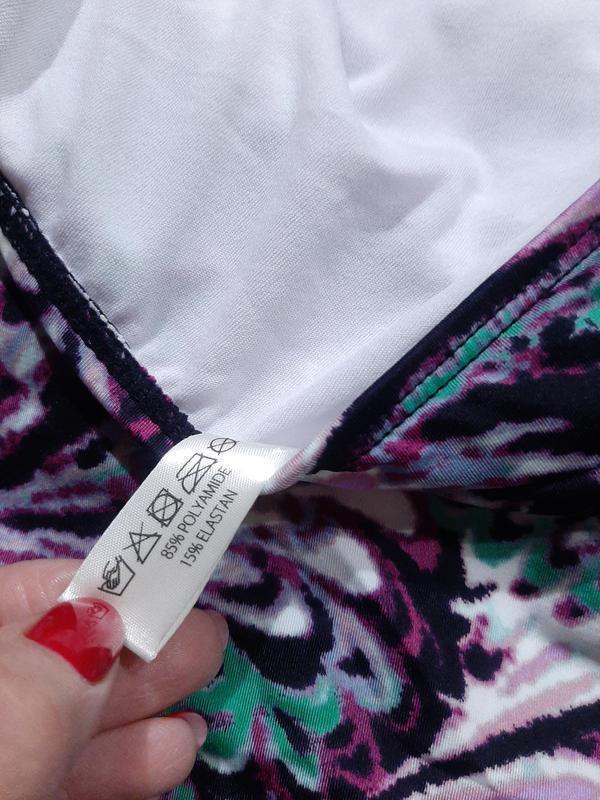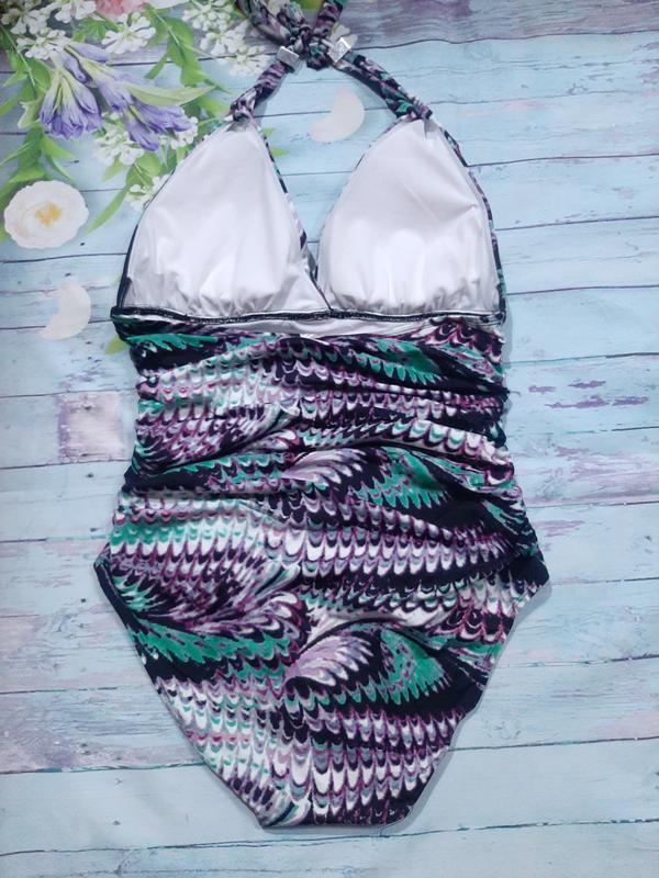 красивый купальник целиком на подкладе декорирован складочками, чтобы скрыть несовершенства фигуры, яркий разноцветный принт завязывается вокруг шеи