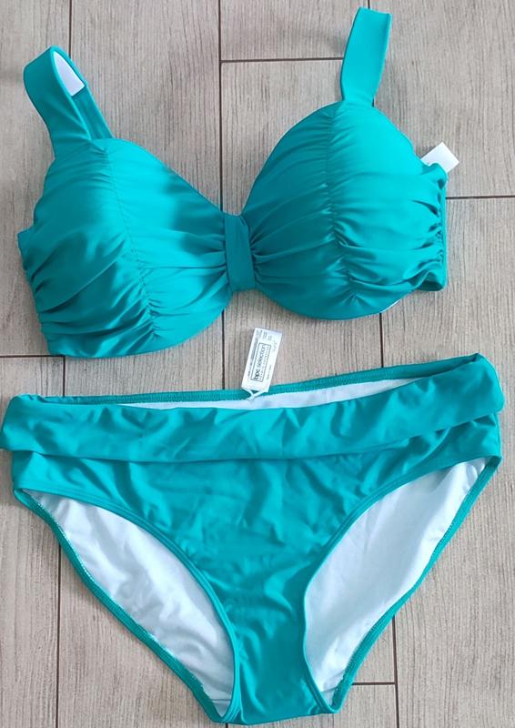 Очень красивый купальник от Bonprix! Мой прикрой пролет Продаю дешевле, чем купила ****************** В реале цвет более насыщенный, очень красивый бирюзово-зеленый. Ткань: плотная, не светится. Вся фурнитура - качественная Лямки на бюсте - широкие, красиво будут держать бюст **************** Размер указан следующим: EUR 46 (90F) F/B 48 (105F) GB 20 (40E) IT 52 (6F) идет на украинский ориентовано 54-56 Мне на ОГ=115см оказался крупноватым **************************** Замеры в спокойном состоянии Плавки: ПОТ=46см (+очень красиво тянется) Высота 32см Есть отворот сверху 5см Бюст: Чашки 23см*28см Ширина с застежкой 83см (красиво тянется)