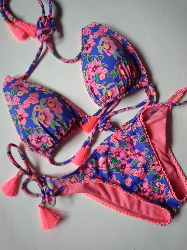 потрясающий яркий купальник в цветочный красивый акварельный узор на синем фоне, кисточки на кончиках украшаю модель, разработан из специального мягкой материала анти хлор и анти соль, реально прослужит вам долго!