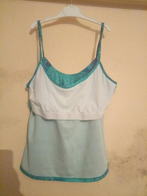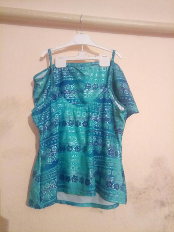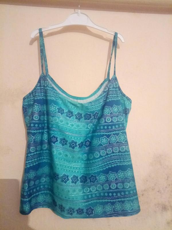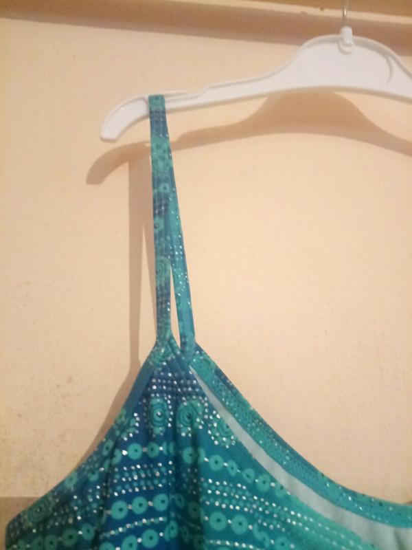 раздельный купальник танкини красивого голубо-бирюзового цвета с серебристым напылением, верх с подкладом в районе бюста, на тонких нерегулируемых бретелях, без паролона, без косточек, плавки слипы, бока широкие.