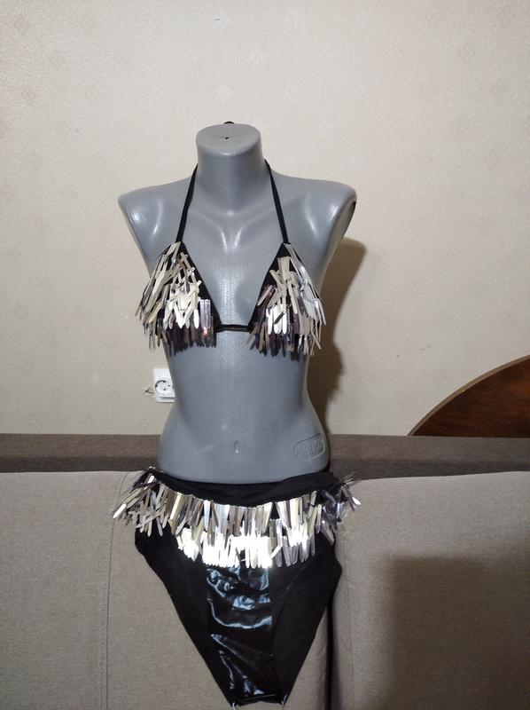 очень эффектная и сексуальная вещица от Flirtz. секси бикини с завышенной посадкой. декорированы металл пайеткой, по бокам сетка, текстиль части под лак. верх шторочки, на завязках. отлично тянется.