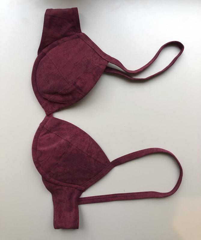 Размер 36 А/В. Ткань с тиснением, ультрасофт. Плотная формованная чашка на кости, металическая застёжка, бретели не съемные. Длина от застёжки до застёжки 70 см.