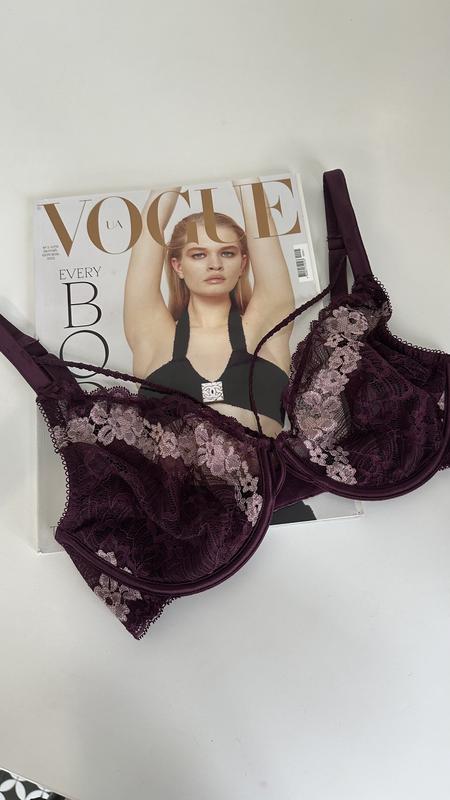 Очень красивый, кружево 2х цветов, сочетание роскоши и стиля. Стрепы между грудей. Тонкие хрупкие полоски. Бюстгальтер идеально тянется, в объеме указано 70 Д, но будет и на 75 С Новенький на обзор, не ношен