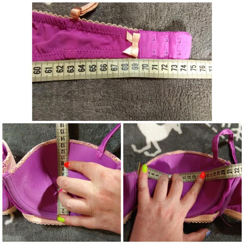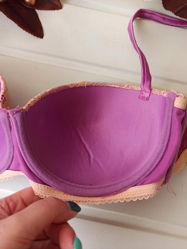 Очень красивый бюстгальтер, обалденного розово-сиреневого цвета сатин и нежнейшее кремовое кружево. Балконетт, с пуш-ап около 0.5-1 см, есть боковые косточки. Беретели не съемные.