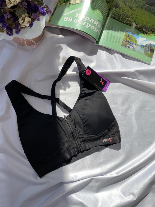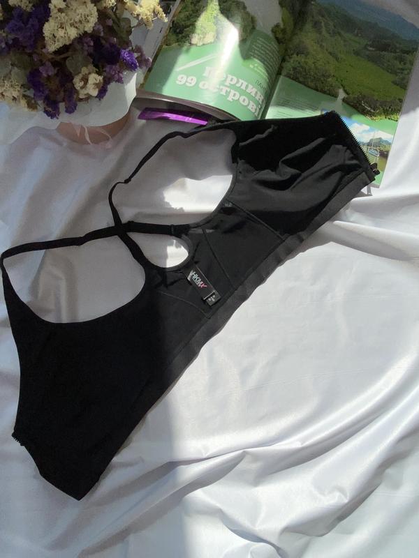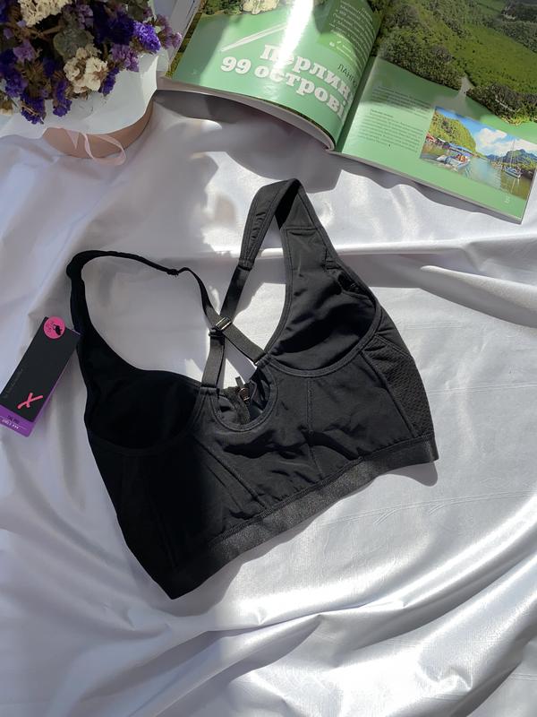 Спортивний бюстгальтер має чашки без поролону та кісточок, застібається попереду на блискавку та має під ній гачок із петелькою. Внутрі є в чашках тонкі вкладиши, що можна виймати. Ідеально на кожен день у будь-яку пору рока та для занять спортом. Спинка йде із сіточки. Бретелі незйомні, регульовані, широкі, позаду йдуть навхрест. бюст має маркування UK 32D EU 70D. склад: 79% поліамід, 7% поліестер, 14% еластан.