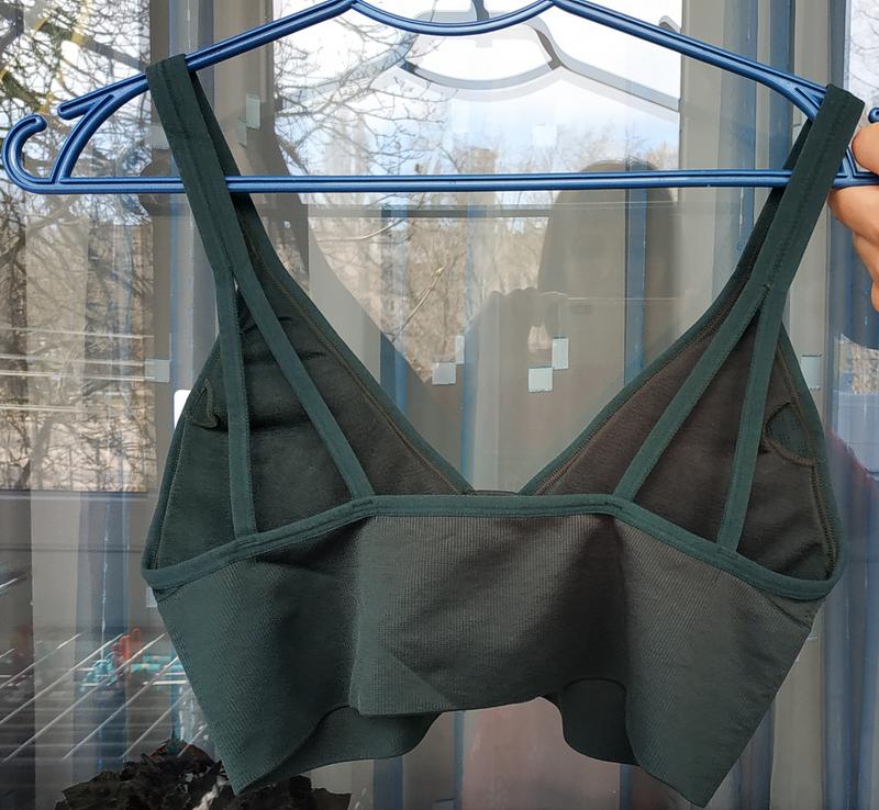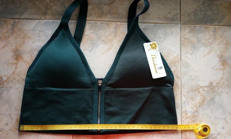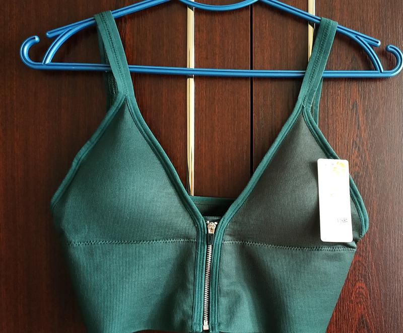 Топ с расстегивающейся молнией спереди, есть съёмные чашечки, цвет зеленый (хаки). Бретели-резиночки раздваиваются на спине. Упакован в zip-пакет.Размер : объём 80,чашка В/С