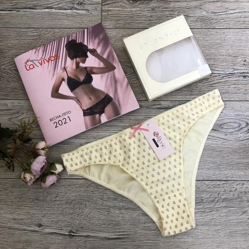 Женские трусики выполнены из мягкого и нежного хлопка с добавлением эластана . Модель - бикини средней посадки , декорирована нежным принтом . Цвет в ассортименте - желтый ( уточняйте у менеджера ) . Размер в наличии : XL ( 50 ) . Таблица размеров женского белья Atlantic Размер S M L XL Обхват талии , см. 66-70 70-74 74-78 78-82 Обхват бедер , см. 90-94 94-98 98-102 102-106