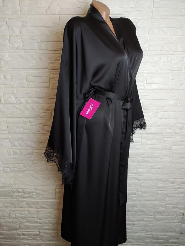 Мягкий, нежный шелк Армани, черный цвет с длинными широкими рукавами и нежным кружевом. Халат на запах, пояс у комплекті. Очень приятный к телу, да и выглядит роскошно) Халатик в одном ромере: XL- 2 XL. Замеры: Довжина-130 см. длина рукава от плеча-59-60 см. В развернутом виде по бедрам 146 см, поэтому подойдет на объем бедер 110-116 см. Если нужно другой размер или длина-надписьит нам, договариваемся о сроке пошива в нашей мастерской после оплаты. Возможно отправить Укрпоштой после оплаты продавцу на карту. Приглашаю посетить мой магазин, чтобы просмотреть множество различных пижам, разные цвета и типы тканей. А также Постельное белье из бязи и Ранфорс. Цены Вас приятно удивят! Заходите, выбирайте, ответьте на все вопросы.