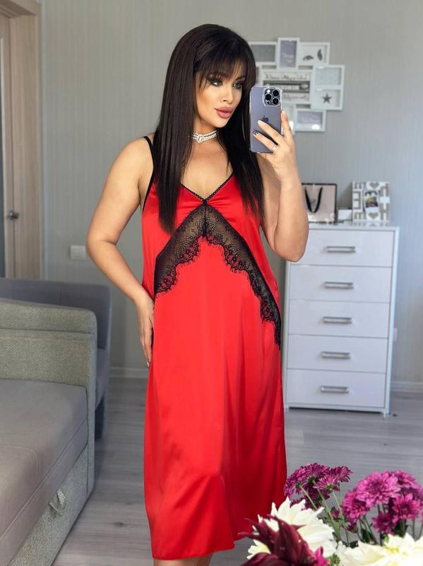 Классическая ночная рубашка на регулируемых бретелях, длина ниже колена, спереди вставка декоративным французским кружевом.