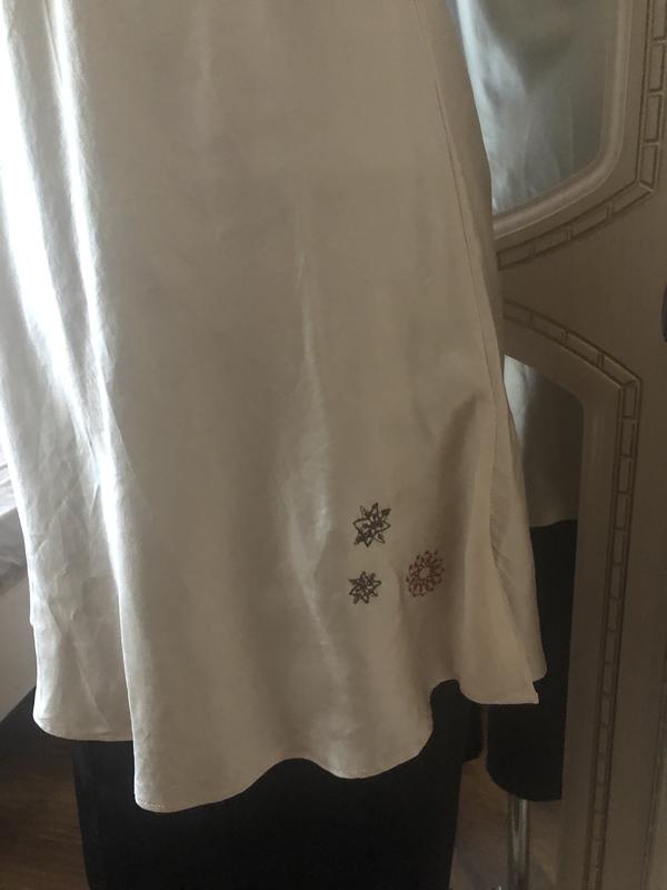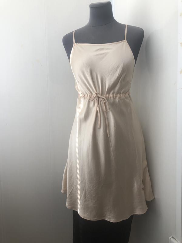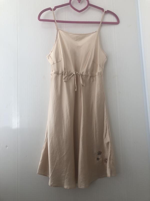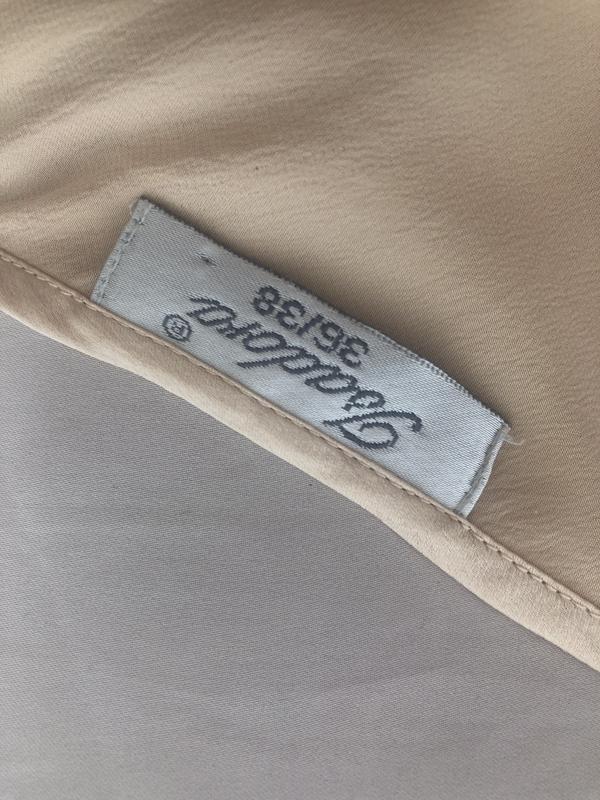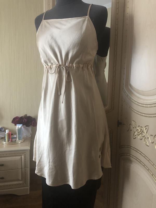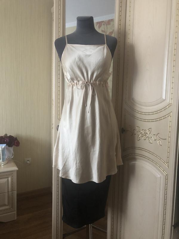 Пог 46, длина 59 от подмышкиРоскошная шелковая вещь. Цвет потрясный золотистый, дорогой. Незаурядный фасон с завязкой под грудью, ничего не жмёт и красиво подчёркивает фигуру. Размер s-m. Вещь в идеале. Как новая.
