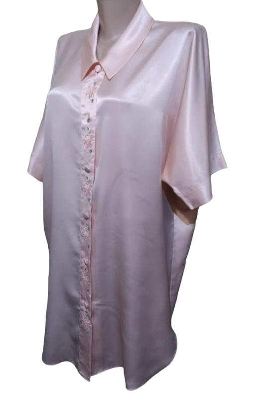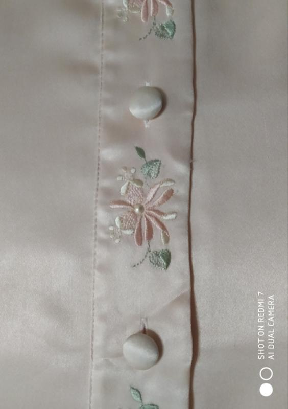 Ночная рубашка свободного кроя, по типу рубашки. Застегивается полностью на пуговицы, планочка с вышивкой. Низ закруглённый по бокам.