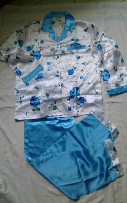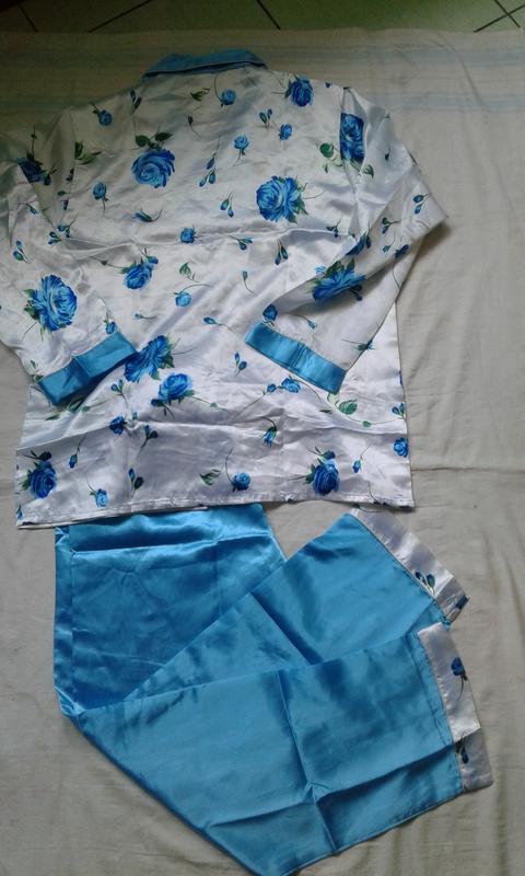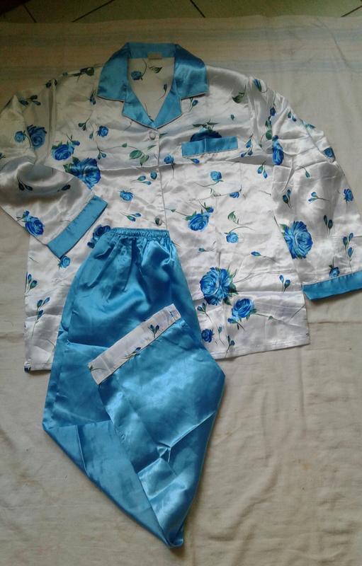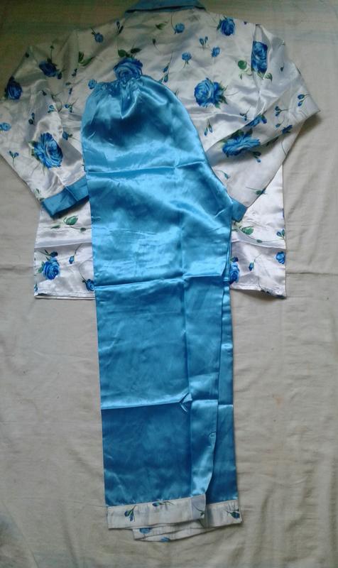 шикарная атласная пижама . Длина куртки 68 см длина рукава от воротника 72 см . пог 54 см . Длина штанов 101 см поб 58 см талия на резинке ( макстмально 95 см ). Состояние новое