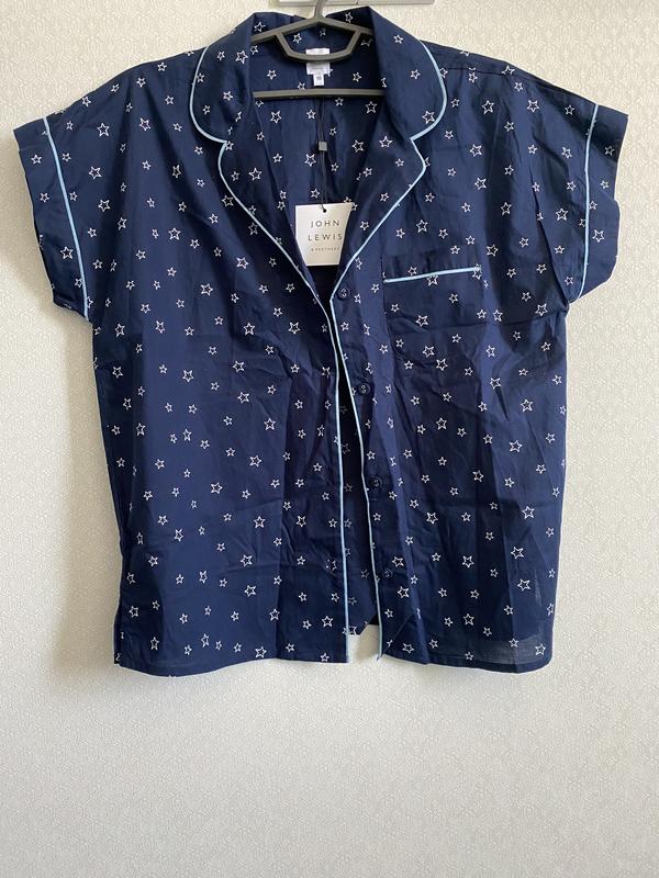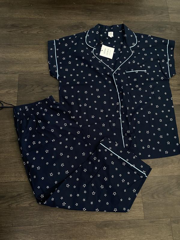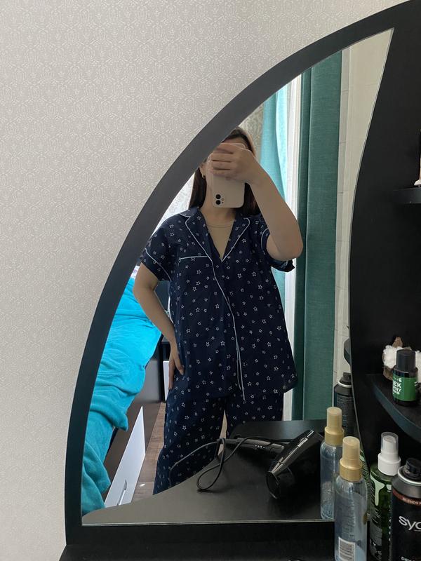 Хлопковая новая пижама в звездочку темно- синего цвета. Тонкая и легкая. Застегивается на пуговицы + одна запасная. Подойдет на размер S-M.