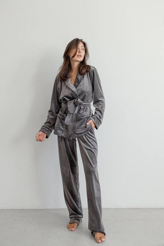 Зимняя женская плюшевая велюровая пижама двойка Eva кофта на запах и штаны костюм для дома цвет серый Велюровая пижама женская которая включает в себя универсальный комплект вещей: брюки, халат на поясе. Данный повседневный набор из приятной мягкой ткани отлично заменит женский домашний костюм и пижаму для сна. Предлагаемый комплект женский с шортами и брюками подходит в качестве теплой пижамы для сна и отдыха, а также в качестве зимнего и осеннего домашнего костюма на повседнев. Велюровые брюки и халат хорошо подходят для одежды для дома. Красивая велюровая бархатная ткань позволит выглядеть элегантно каждый день и даже во время сна. Это красивая теплая женская пижама и отличный подростковый комплект для сна отлично смотрится на девушках и женщинах с самым разным типом фигур, идеально подчеркивая красоту и соблазнительность форм. Велюровый халат женский дополнит образ, сделав комплект еще более практичным и комфортным в использовании. Такая женская пижама оверсайз хорошо подойдет, например, для роддома. Домашняя одежда - универсальное решение одежды для дома. Уютный комплект для сна сделает ваш отдых приятнее. В домашнем костюме для женщин вы будете чувствовать себя красивой, современной и свободной. Размеры: XS, S, M, L, XL Размер ХS Полуохват груди 51 см Талия 28 см, но там резинка тянется до 38 см Бедро 47 см Длина кофты 67 см Длина брюк 102 см Длина рукава 61см Плечи 40 см Размер S Полуохват груди 54 см Талия 30 см, но там резинка тянется до 43 см Бедро 49 см Длина кофты 68 см Длина брюк 102 см Длина рукава 62 см Плечи 40 см Размер М Полуохват груди 55 см Талия 32 см, но там резинка тянется 43 см Бедро 51см Длина кофты 68 см Длина брюк 102 см Длина рукава 62 см Плечи 45см Размер L Полуохват груди 58 см Талия 35см, но там резинка тянется 49 см Бедро 53см Длина кофты 68 см Длина брюк 102 см Длина рукава 62 см Плечи 48 см Размер XL Полуохват груди 65 см Талия 40см ,но там резинка тянется 68 см Бедро 62 см Длина кофты 74 см Длина брюк 106 см Длина рукава 63 см Плечи 48 см
