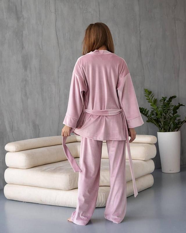 Велюровая женская домашняя пижама тройка халат футболка и штаны красивый