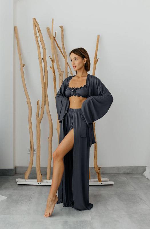 Унікальний домашній костюм-трійка із тканини трикотаж двунитка. Комплект: халат із широкими рукавами, зручний ліф з резинчастою основою на застібці та вільного крою довгі штани із розрізами спереду. Натуральна тканина досить еластична, не мнеться, зносостійка, довго зберігає початковий вигляд, чудово пропускає повітря та дуже приємна до тіла. Це яскравий приклад того, що можна одягатися стильно, а головне комфортно, не тільки на вулиці, але й вдома. Колір: Білий, чорний, сірий Склад: 92% бавовна, 8% еластан