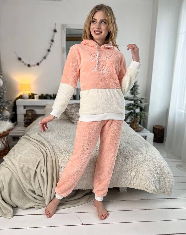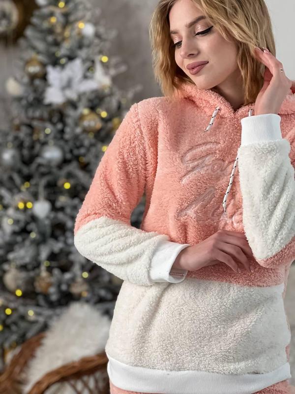 Тепла жіноча піжама флісова з малюнками махрова персикова, костюм для дому
