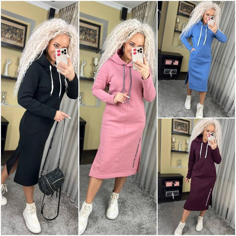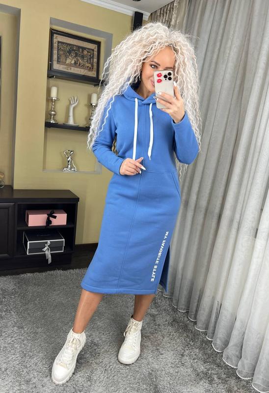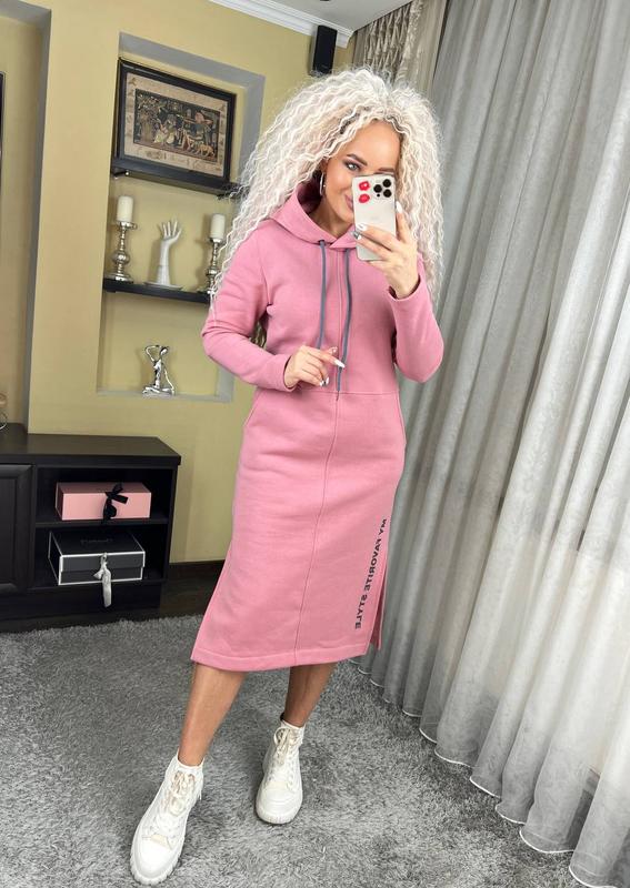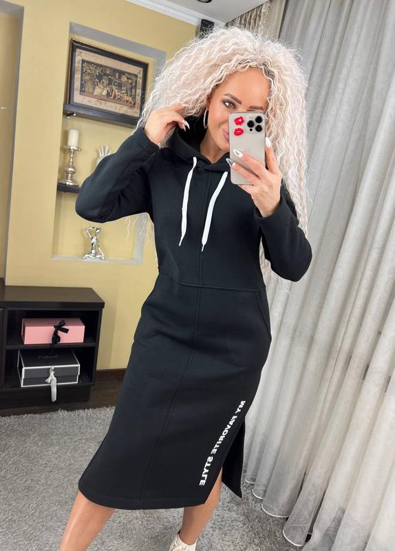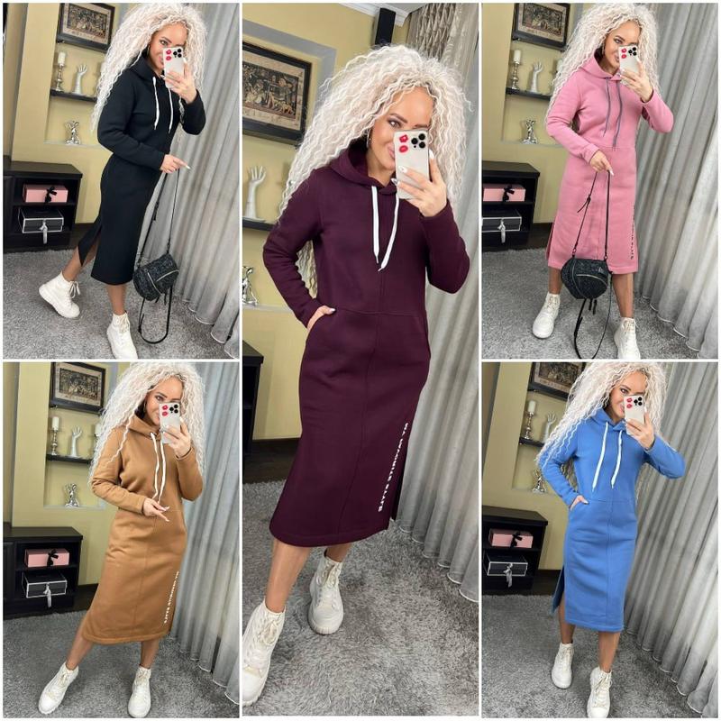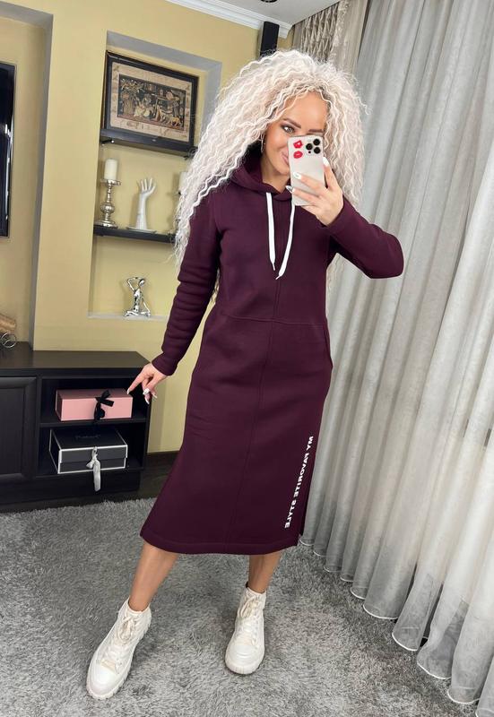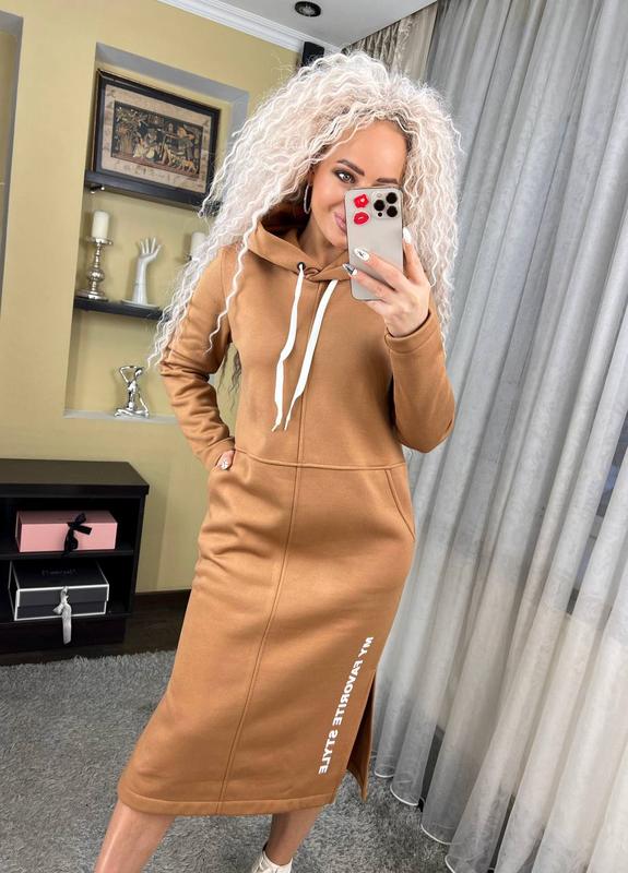 Теплое спортивное платье с капюшоном длина миди "Женева" замечательно садится на любой тип фигуры, удобное, практичное, не сковывает движения. Эта модель идеально подойдет для повседневной носки, сзади капюшон, длинный рукав, по бокам разрезы и карманы.