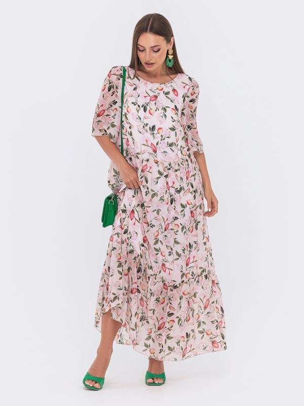 Вільна сукня-максі із шифону. Виріб відрізний по талії з воланом по низу. Доповнено підкладкою із попліну. Застібається на гудзик по спинці. Комплектується поясом із основного матеріалу.