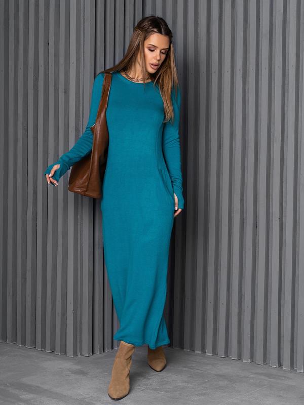 Утепленное ангорой трикотажное платье бирюзового цвета. Платье с длиной в пол и длинными прямыми рукавами. Модель прямого облегающего кроя с полукруглой проймой горловины и разрезом сзади. Изделие с боковыми карманами и вырезом на рукавах для пальцев.