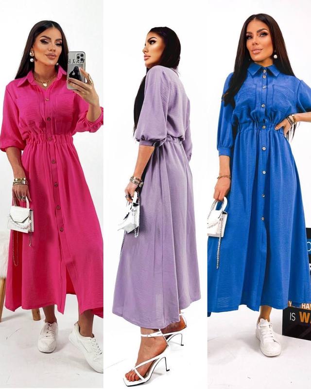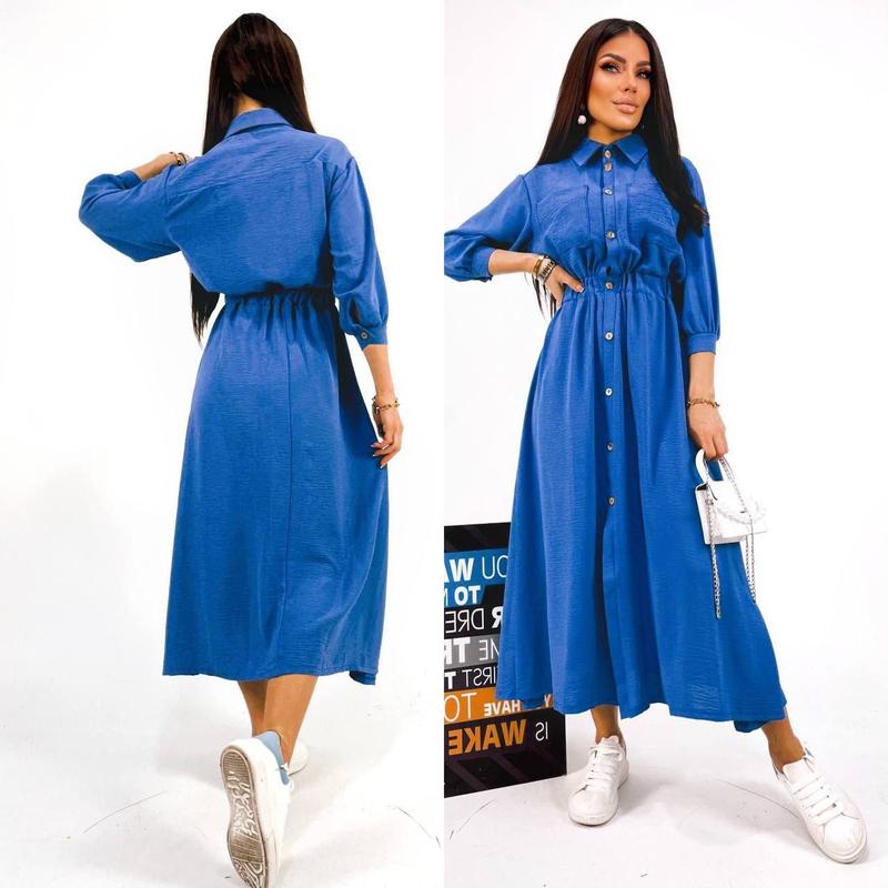 Описание: Платье-рубашка макси длины с широкой резинкой на поясе и свободными рукавами длиной 3/4.
