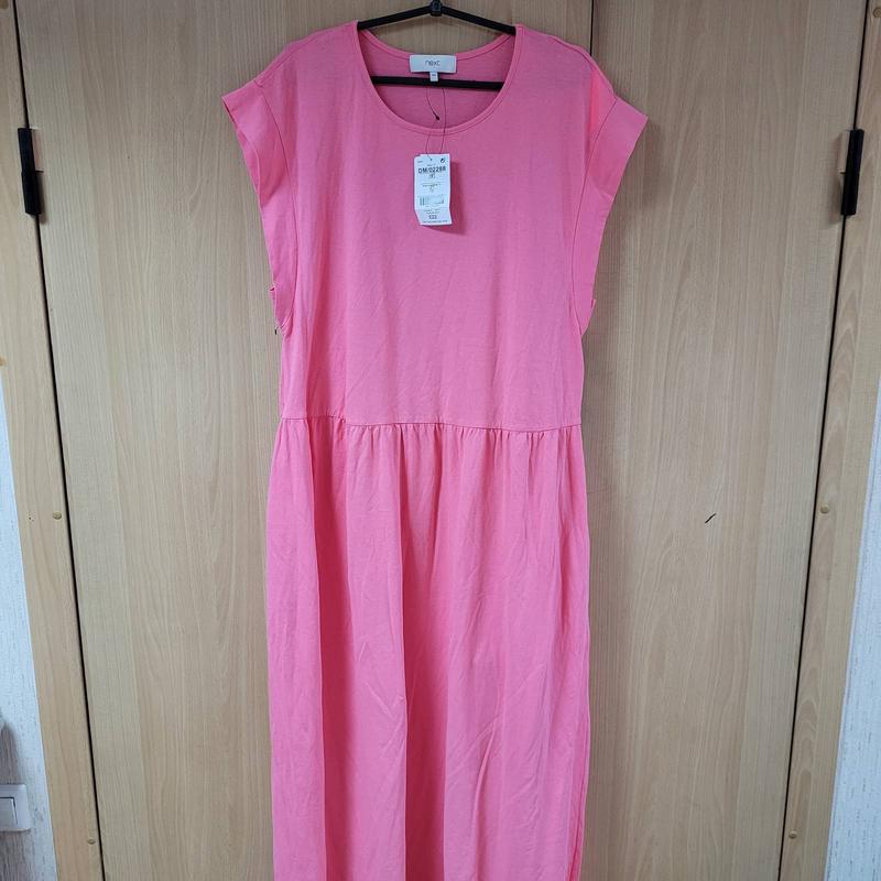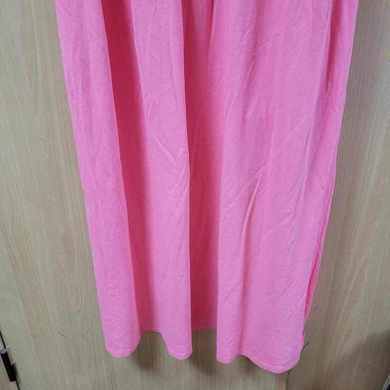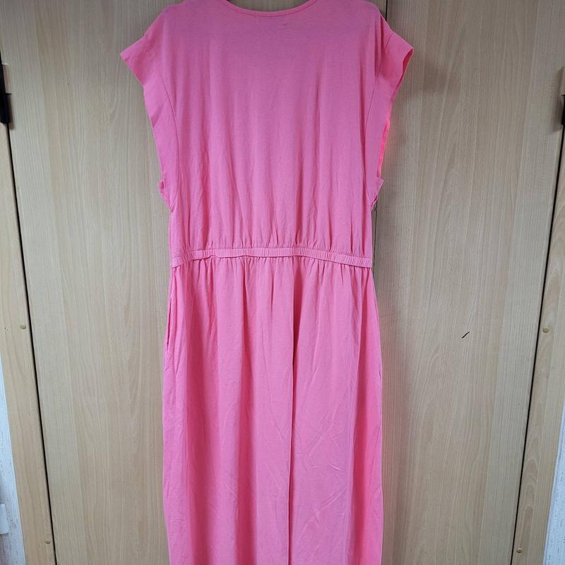 Трикотажное длинное платье большого размера с боковыми карманами, талия на резинке, рукав спущенный. Цвет розовый. Ог 108+, талия 104+, Об 160+, длина 139.