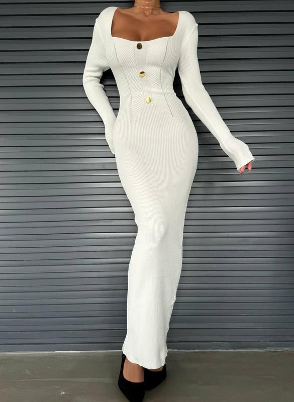 Элегантное платье длины максы. Отличается классическим прилегающим силуэтом, глубоким квадратным вырезом на груди и прямой юбкой. Универсальная модель позволяет создавать эффектные образы различных стилей.