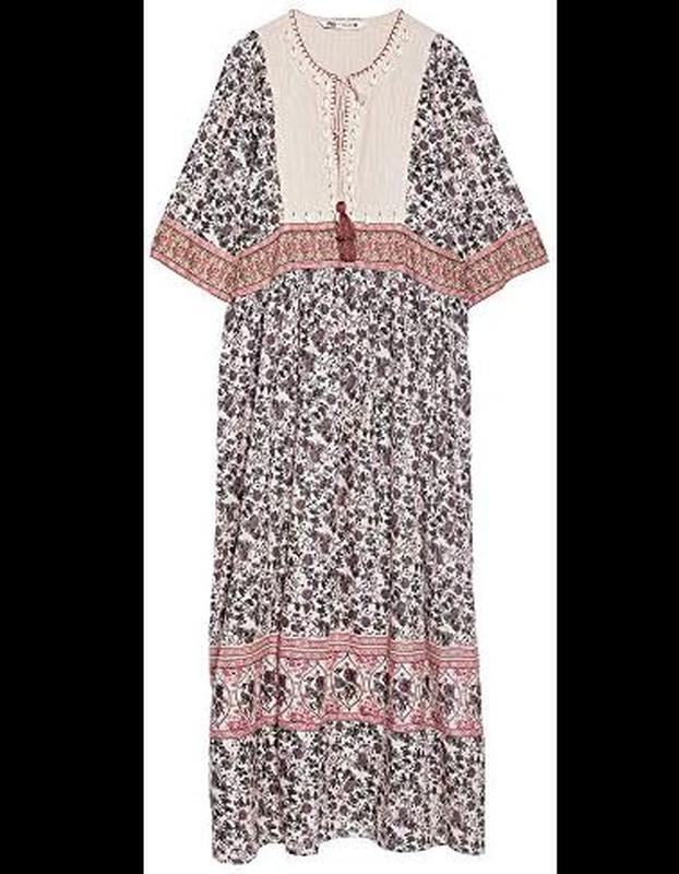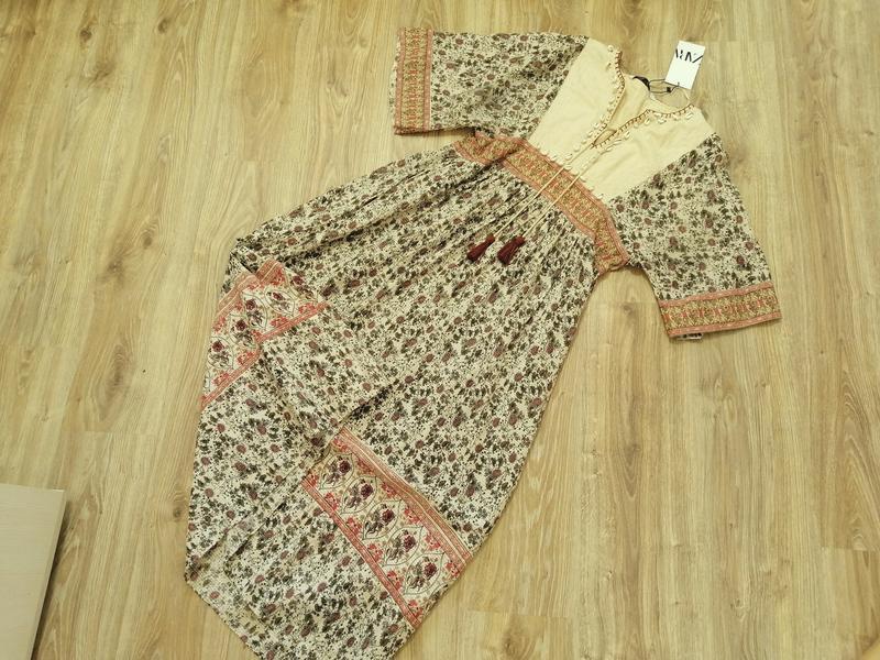 Новое платье без бирки (утеряна) zara m, оверсайз до хл, можно для беременных. Одна из лучших и комфортных моделей за всю последнюю историю бренда. Свободное, не жаркое, приятный индийский хлопок с принтом рустик. Можно для полных рук. Высокая талия 48 см, по линии бедер клеш, ширина около 90 см, шва под грудью нет, там сквозная линия через заниженные рукава. длина 132 см. Мерялось на обьемы в груди 95 см, как раз, можно быть меньше. Талия максимум может быть 85 см