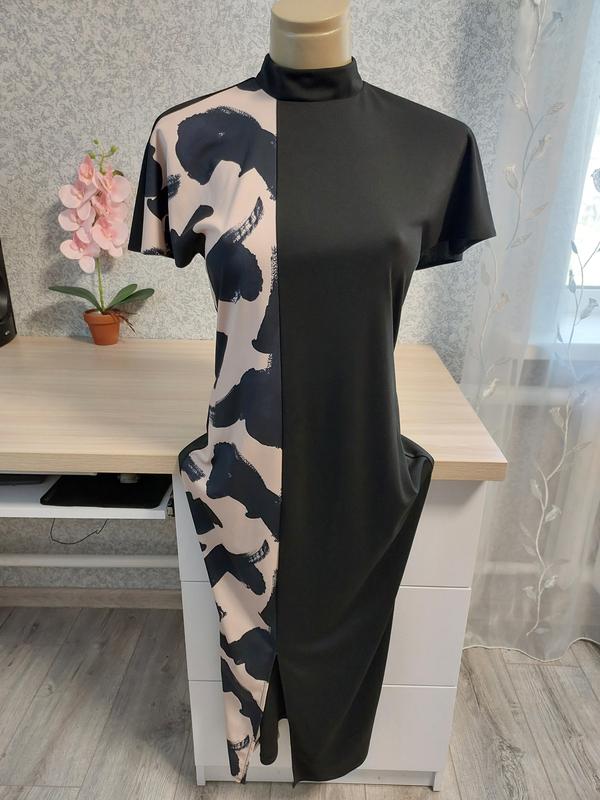 Женское черное с бежевым цветом платье длинное с размером с переду. Размером S, из полиэстра и эластана. В идеальном состоянии, тянется, все замеры на фото, качество отличное.