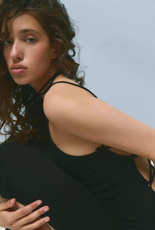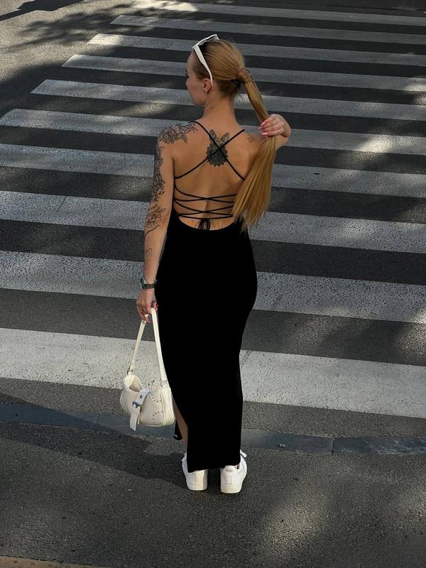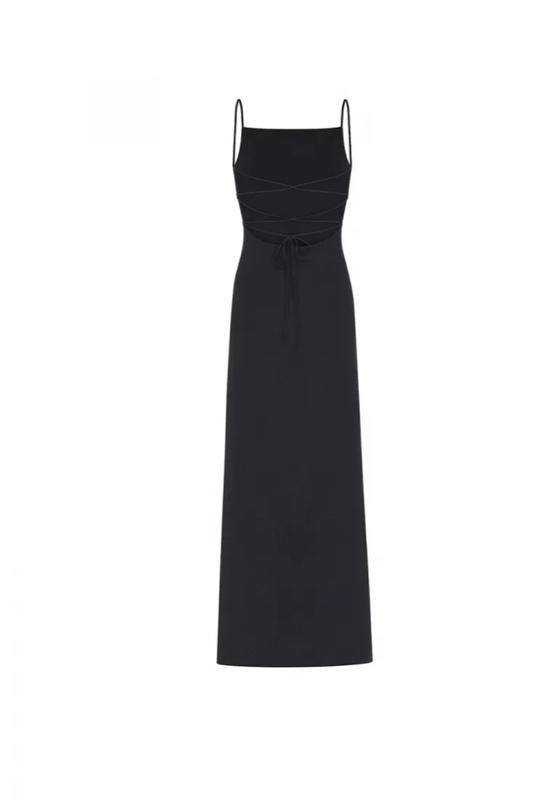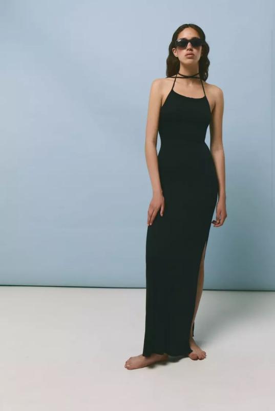 Разрез на ноге. Завязки на спине. Прямой вырез спереди и узкие бретели.