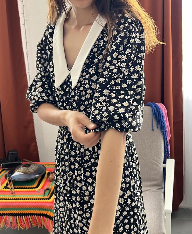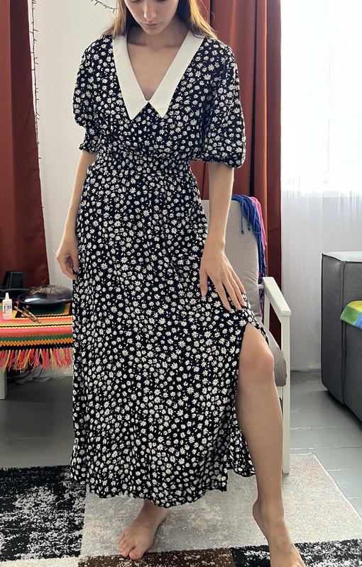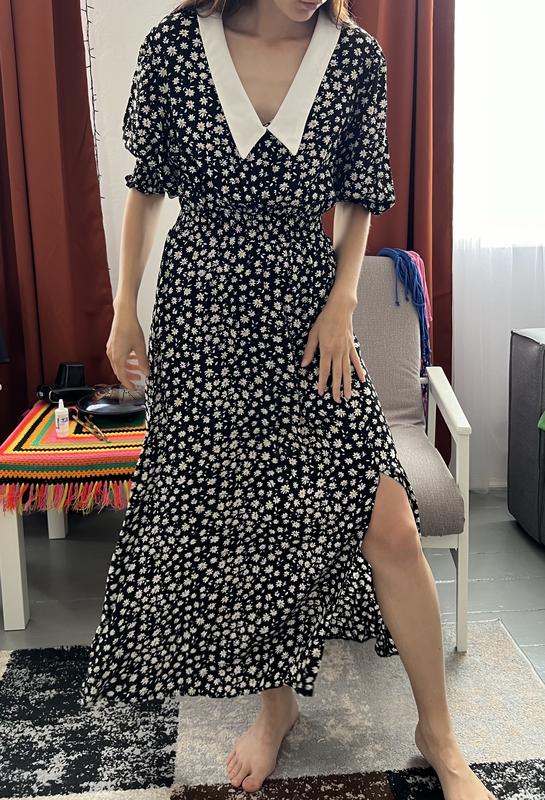 Черное платье с белыми цветами и белым воротником. На поясі резинка. Рукава тоже на резинке. Имеет разрез. Ткань вискоза