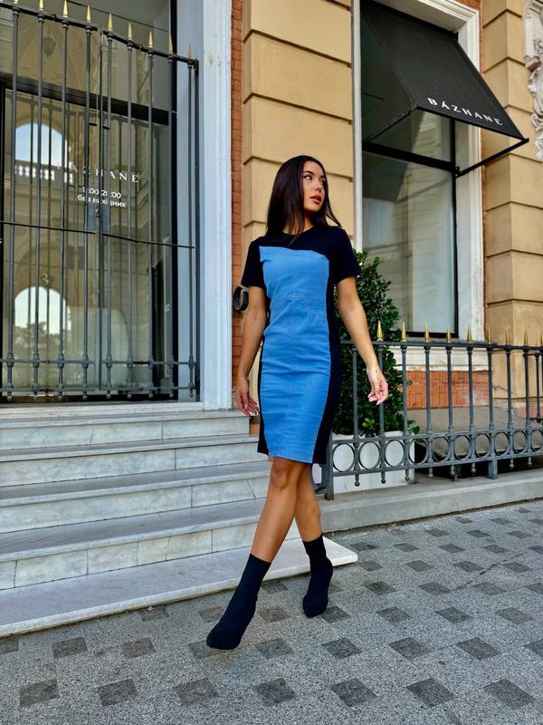 Материал: Верхняя часть платья выполнена из черного трикотажа, а основная часть – из светло-синего джинсового материала.
