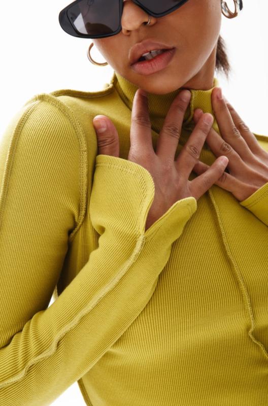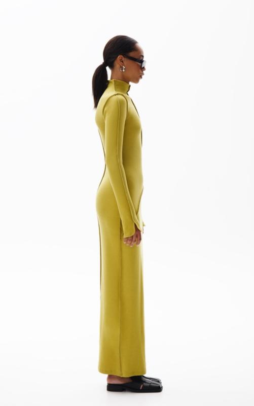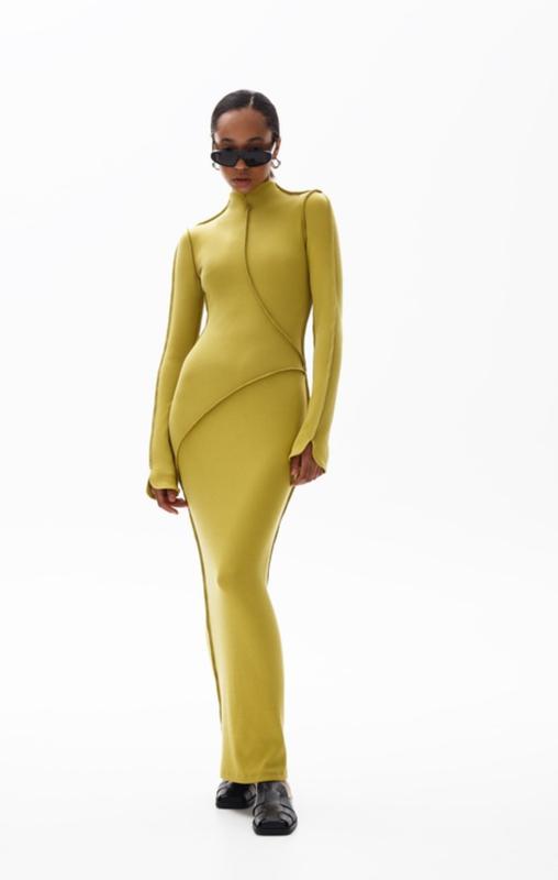 Платье силуэтное, выполнено из трикотажного рубчика, с наружными швами. Длину и цвет ткани можно выбрать на выбор.