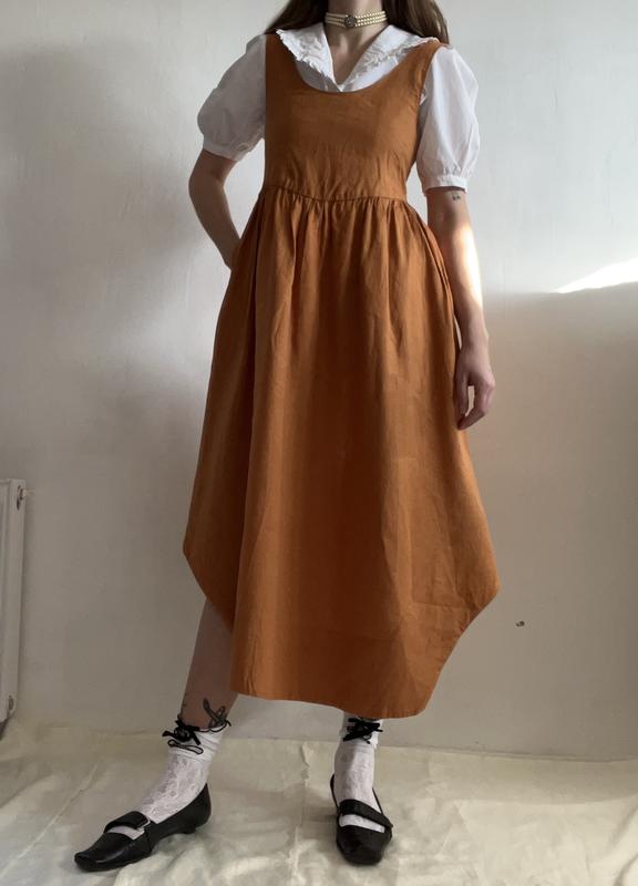 Очень классное, длинное платье, изготовленное из 100% органического льна 🌿 Имеет интересный крой - по бокам короче, чем спереди и сзади для комфортной ходьбы (см фото 2) Лямки платья сзади на пуговицах Размер указанный ХС, крой - оверсайз, однако на фото надежен на М (90-70-100, рост 176) Имеет две боковых вшитых кешьена Состояние отлично