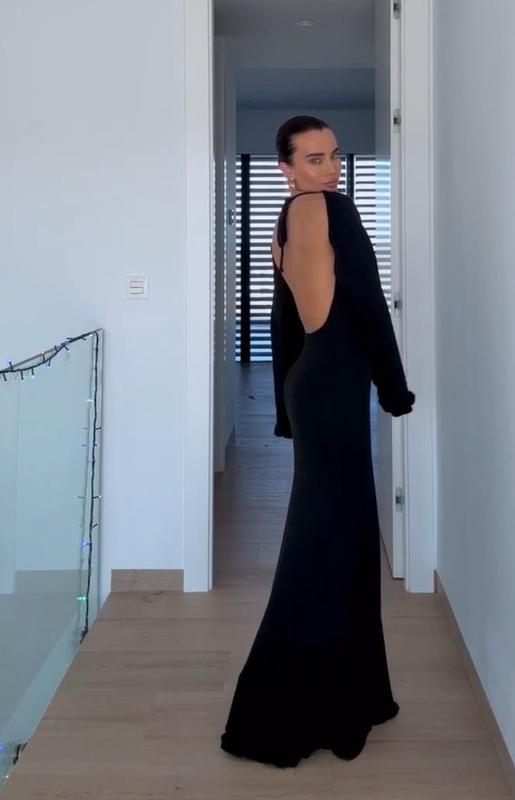 Дизайнерское длинное платье с открытой спинкой и длинными рукавами с рюшами.