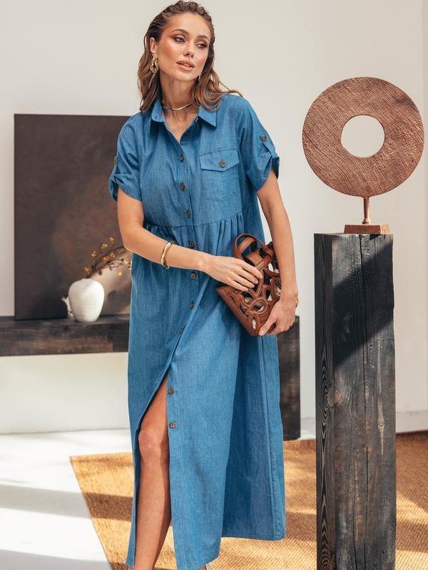 Свободное платье-рубашка в стиле сафари из тонкого джинса. Рукав регулируется шлевками. Застегивается на пуговицы по всей длине.