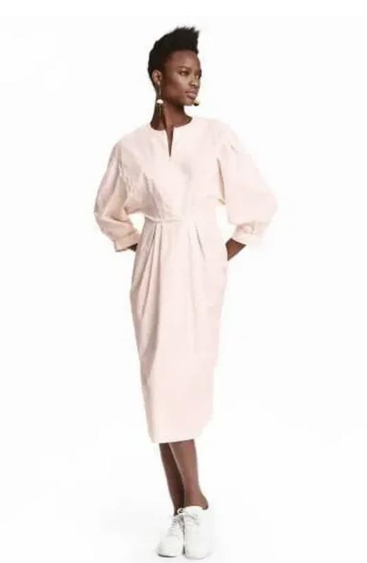 Сукня - чохол стильного крою, з легкого приємного котону, на металевій блискавці по спинці З прихованою блискавкою спереду Та пишними рукавами 3/4 Колір блідо-рожевий, свіжий і ніжний. Без підкладки Розмір 36 (6) на зріст 165/84 см. Якісний приємний до тіла тонкий котон. Пошиття прекрасне. Стан ідеальний (вдягалася пару разів)
