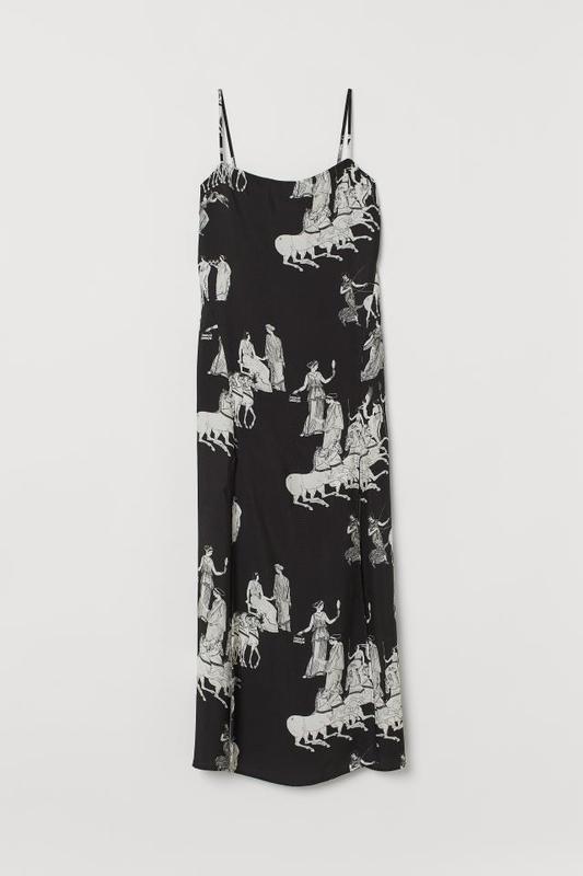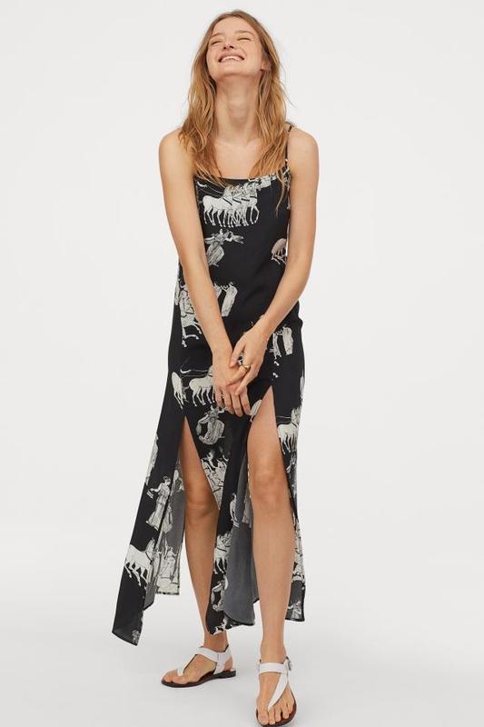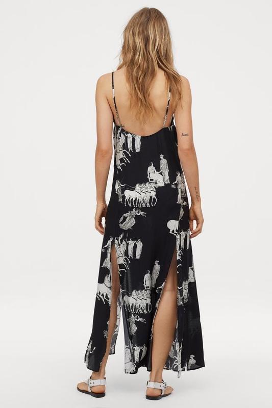 Длинное платье без рукавов из структурной вискозной ткани с принтом. Прямой крой сверху и очень узкие бретели. Глубокий вырез сзади. По бокам клинья для дополнительного объема снизу. Двойная высокая шлица спереди и сзади. Без подкладки.