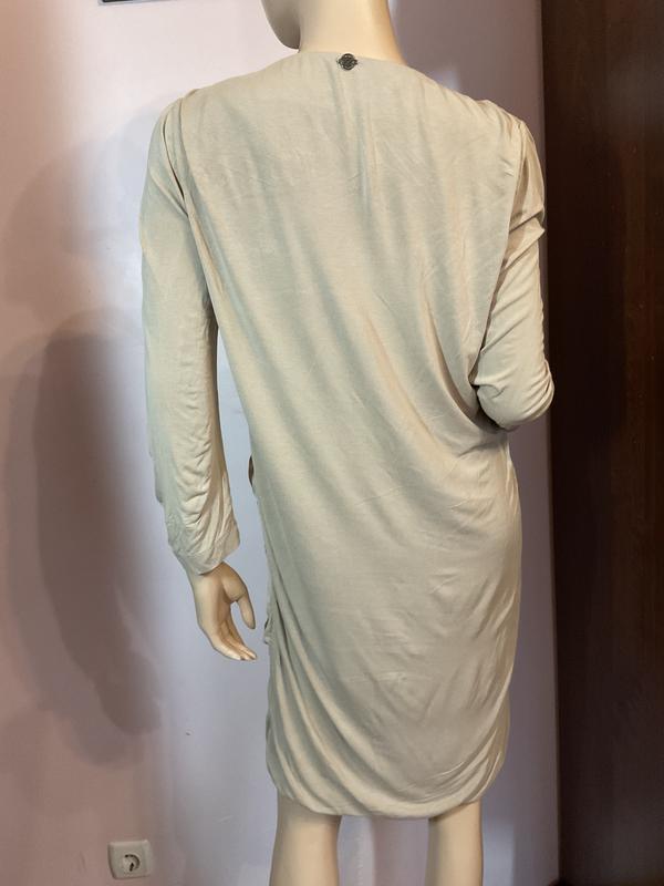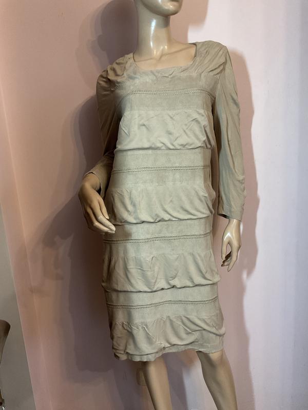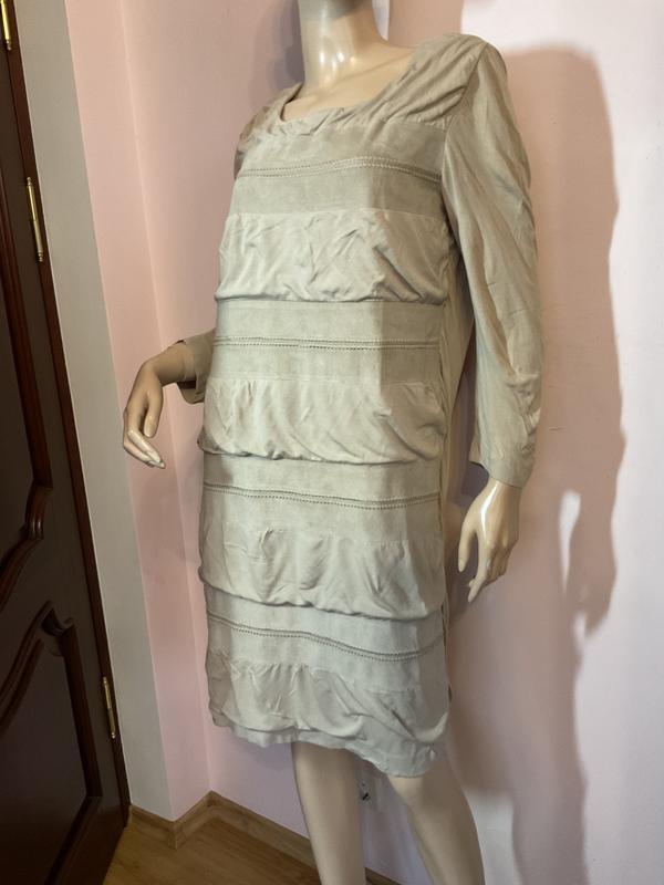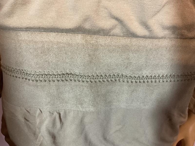 Трикотаж середній, полоски під замшу. Без підкладки кругом е тільки зад , не просвічуться. Заміри в грудях 50смвталіі 50см в бедрах 52см довжина100см рукав 56см в плечах 38см ..пілкладка на полосах тонка в деяких містах е затяжки